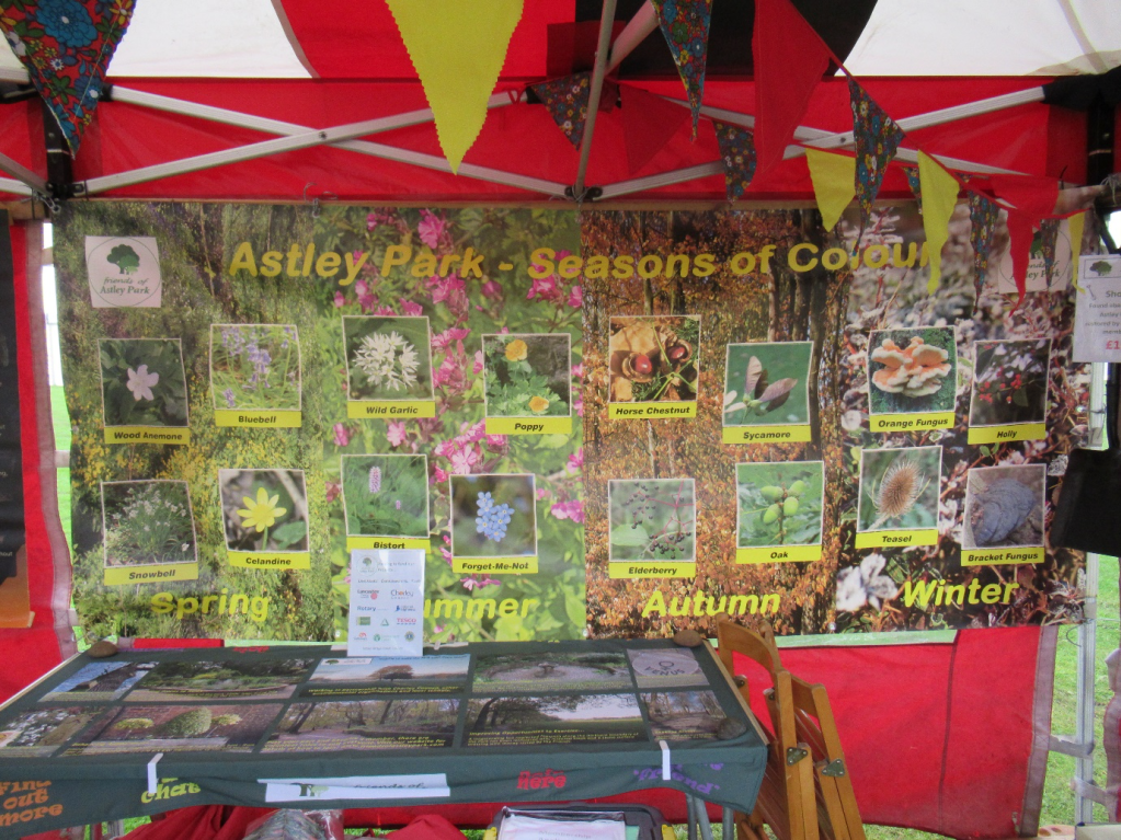 This year we had a new large ‘four seasons’ banner designed by our member Sue Jackson, featuring wild flowers, nuts, berries, and fungi she had photographed in the Park. We also displayed our new bunting made by Sue and fellow member Sue Giles. It all made for an eye catching effect.