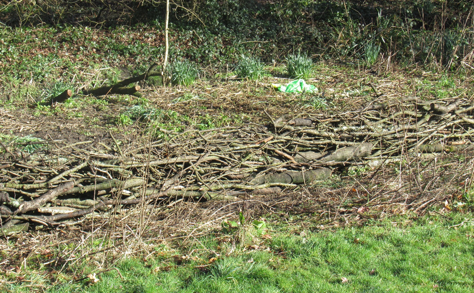 The barrier, about 1 metre high by approximately 15 metres long, will restrict access to the river which has steep sides at this point. The work has also left clear views of daffodil clusters that will soon be in flower and the barrier will hopefully be a refuge for wildlife.