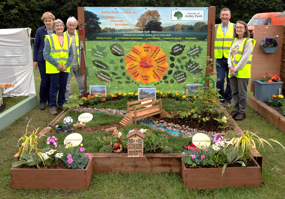 After months of preparation and days of setting up by the exhibitors the Chorley Flower Show opened to sunny skies at 10am this morning and continues until Sunday (28th July). This year numerous groups have produced Community Gardens including the Friends. Designed and led by our Committee member Jan Sanderson and assisted by Friends volunteers Connie and David Joyce, Steve Hodgson, Lynda Sutch and Sue Jackson, the team have produced a highly distinctive and colourful model garden replicating the key features of Astley Park.