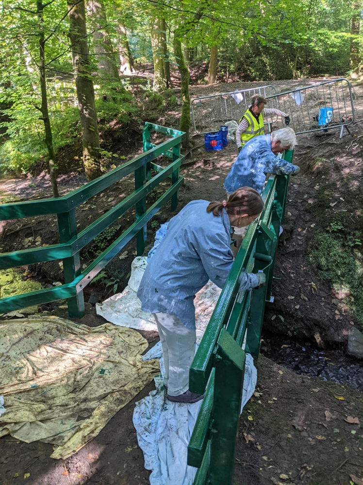 There are a total of 11 footbridges in Great Wood, seven of these have aluminium balustrade railings and four have timber ones. Friends’ volunteers are first smartening up the metal bridges using paint and painting equipment kindly given to us by Chorley Council. Preparing these bridges for recoating has been a task in itself. Special thanks for that go to our members Steve Hodgson, ably assisted by Sue Giles, who first cleaned all the bridges. Following that, teams of our volunteers have got on with the painting job – as pictured below.