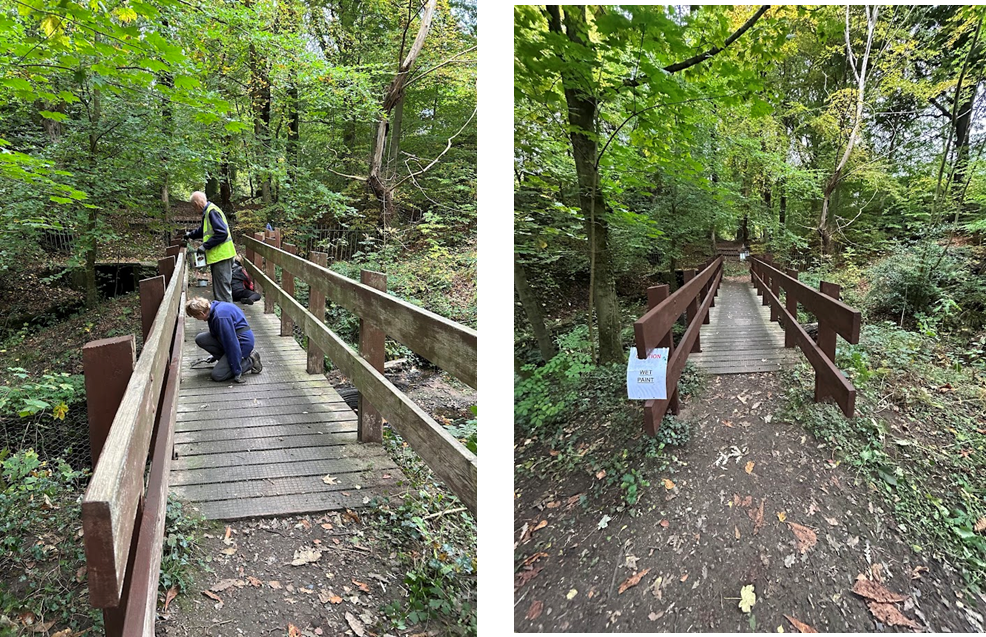 Secondly, Friends’ volunteers have been busy staining the handrails of a footbridge that connects the Park with the Farthings housing estate. Pictured below is the work in progress and the finished result.