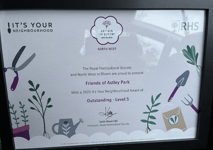 Repeating our success of last year, Friends of Astley Park have once again won big at the 2025 Royal Horticultural Society/North West in Bloom – It’s Your Neighbourhood awards ceremony. We scored a Level 5 – Outstanding mark recognising the various high standard ways we help maintain and improve the Park for the enjoyment of the local community.
