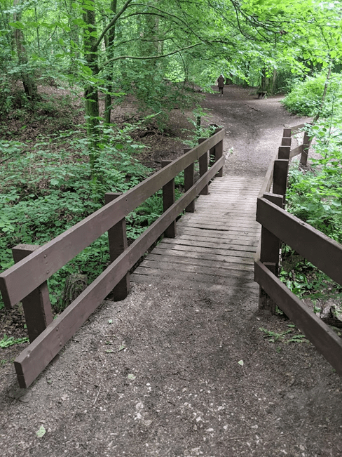 Friends’ volunteers were again working on the timber balustrades of footbridges in Great Wood recently. These ones needed a great deal of preparatory work. Not just cleaning off years of accumulated algae and grime but also removing inappropriate white primer before they could be properly stained. See below for the before, during and after pictures. What a transformation!
