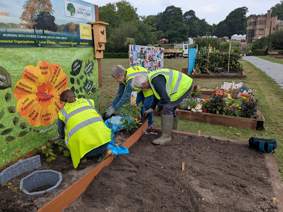 Currently in the days before the Show opens our volunteers are building our community garden (pictured below). The garden has been designed by our member Jan Sanderson; it is a miniature representation of the Park featuring projects achieved by the Friends during the 2010s decade.