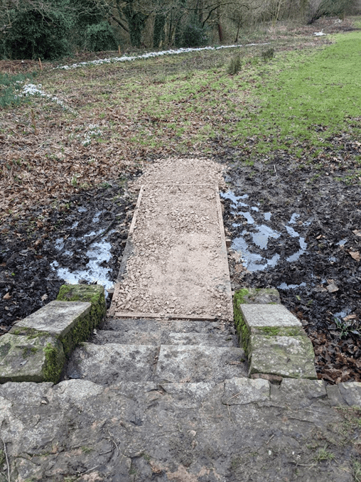 Use of the steps down from the main path opposite the Hall to the Snowdrop Trail has long been difficult because of the very muddy conditions at the bottom – especially in the winter.