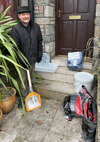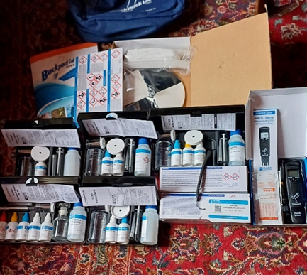 We successfully received a grant from United Utilities to cover the cost of the equipment. The photograph above shows our Chair, Steve Rhodes, with the sampling net, various containers, waders and water testing kit – blue bag. The picture below shows the full contents of the water testing kit!