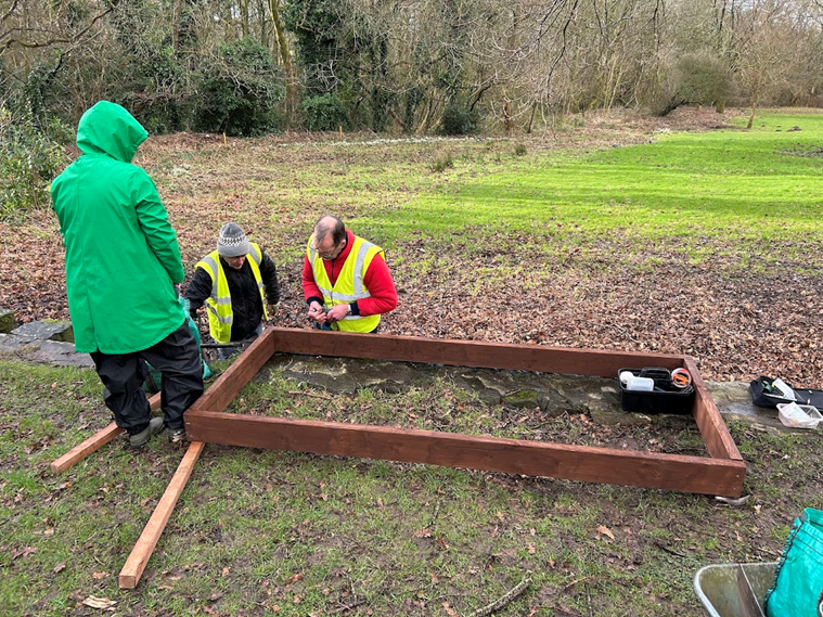 Friends’ volunteers have recently constructed a sturdy timber framework and then secured it firmly in the ground at the foot of the steps. Council staff then filled it with stone aggregate to make an all-weather platform/landing to allow pedestrians to avoid the deep mud – just in time for this year’s Snowdrop Trail display.