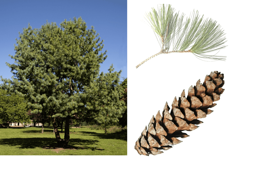Pines are to conifers what Oaks are to broadleaves – the most widespread and most varied of their order. There are over 100 species of Pine found across North America, Asia and Europe. There is only one Pine species native to Britain – the Scots Pine. Pines are characterised by having long needled leaves arranged in tight bundles of from two to five needles each according to the species. Also indicative of the different species is the shape of the reproductive cones. The specimen pictured has needles 8 to 12 cm in length bundled in fives and has cones over 20cm long. The Bhutan Pine is a native of the Himalayas first brought to Britain in the early 1820s. This species matures at a height of 17 to 22 metres and typically lives up to 300 years.