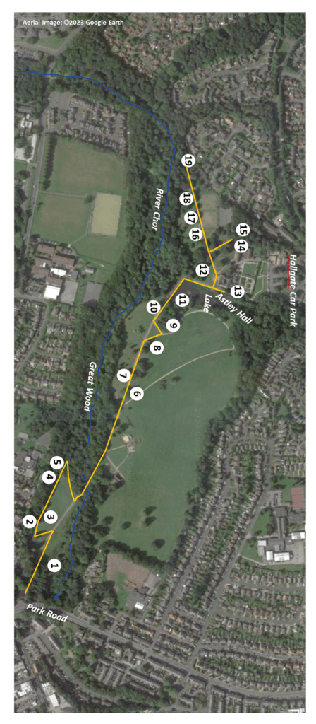 The Trail is presented as a self-guided walk that can be completed in about 30 minutes. The trees are listed in an order that starts from near the main gates at Park Road. It then proceeds past the Sensory Garden and then back to the main path where it crosses the River Chor. The Trail then continues along the main path towards Astley Hall before continuing down the side of the bowling greens and finishing next to the nearby River Chor bridge. However, the Trail can be followed in whatever direction you wish. All 19 trees included can be seen from made paths in the Park.